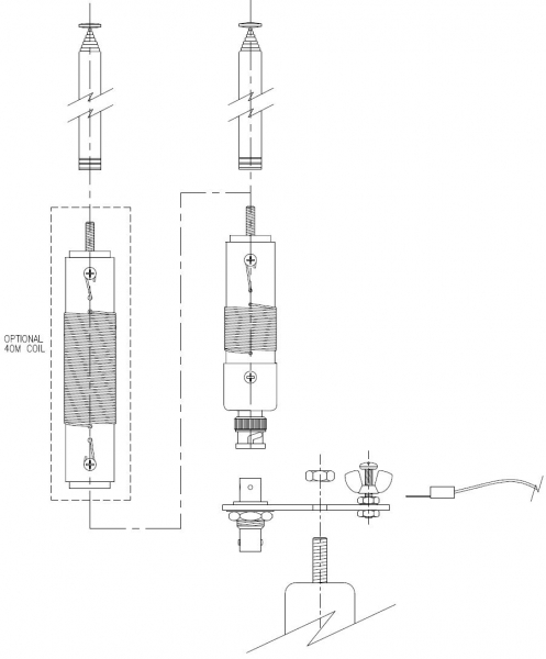 The DS1 and 40m add-on coil have been retired. They have been replaced with the CLV Center Loaded Vertical Antenna. The CLV has higher Q and efficiency moving the base loaded coil to the center of the antenna. It can be seen at: