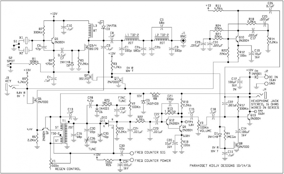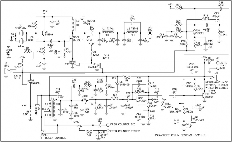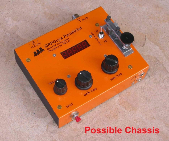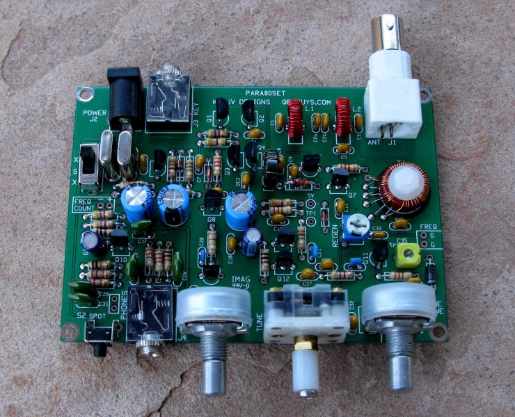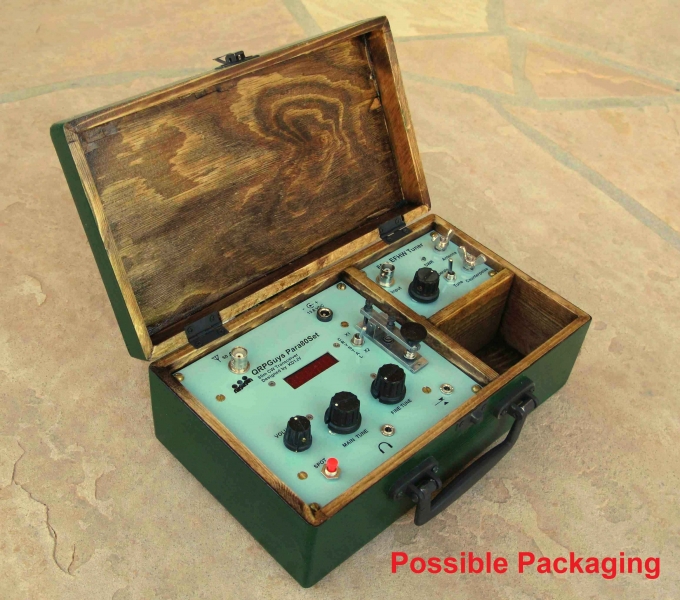 We are pleased to announce that Steve Weber (KD1JV) has updated his MAS-80 transceiver for QRPGuys to offer as a kit. Steve originally designed it for the M.A.S. design contest (minimum art session), a contest started by Dr. Harmut “Hal” Weber, DJ7ST. (Now a SK). The idea behind this contest is to encourage Hams to build and operate a rig using a minimal number of parts. Steve has made some improvements and modifications and the result is the Para80set or Para40set. It is named to commemorate the “Paraset” clandestine vacuum tube transceiver that was parachuted behind enemy lines to Allied resistance groups in northern Europe, and Scandinavia during WW II. Steve’s new design incorporates a sensitive stable regenerative receiver covering ~270kHz, ~3 watt output @13.8V 80m or 40m crystal controlled CW transmitter like the original “Paraset”, but with modern solid state components that conforms to today’s spectral purity requirements, a “spot” switch, (3.560MHz and 3.5795MHz for 80m), or (7.030MHz for 40m) crystals. It is a standalone, thru hole, single board kit, that is powered by 12-13.8VDC, with a silkscreened PCB that can be used as is, or mounted in a chassis or case of your choosing. The board measures 4.00″ x 2.90″. All controls and components are board mounted, Main Tuning, Fine Tuning, Volume, and Regen. You will need to supply your own control knobs. Rear connections are female BNC antenna jack, standard 3.5mm jack for key, and a 5.5mm x 2.1mm 12VDC power jack. Earphone jack (3.5mm) is on the front. We show three possible homemade cases you can make. Sensitivity ~.5uV MDS. Current usage, TX ~460mA@13.8V, RX ~20mA. On a scale of 1 to 5, 5 being the most difficult, this is rated as a 3. Allow 3 to 4 hours to build. If you desire, the board has power and signal outputs for our digital dial, but it would need to ordered separately.